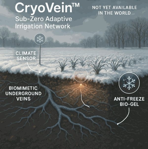 Poland’s agriculture faces harsh winters and unpredictable climate shocks. CryoVein™ introduces a biomimetic underground irrigation system enhanced with climate sensors, anti-freeze bio-gels, and adaptive veins that protect crops against sub-zero conditions. This disruptive framework empowers Polish farming to maintain yield stability even during extreme winters — a world-first in agricultural resilience.